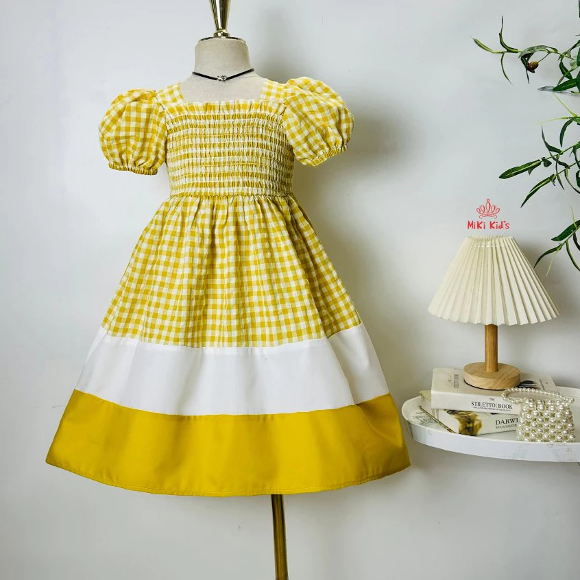 - Đầm caro sọc có họa tiết: Mẫu đầm này có thiết kế dễ thương và phù hợp với các bé gái nhỏ tuổi.