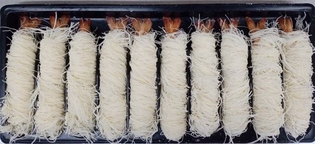 Sợi Kataifi, hay còn gọi là sợi Fillo, là bột mì được kéo thành sợi cực mảnh, có kích thước bằng khoảng 1/3 sợi bún Việt. Đặc biệt, sau khi chiên, sợi sẽ giòn thơm, không hút dầu và giữ hình dáng bắt mắt, cùng khả năng giữ độ ẩm bên trong, giúp sản phẩm đạt tính thẩm mỹ và chất lượng ổn định khi sản xuất hàng loạt. Với cấu trúc mỏng dẹt, sợi Kataifi tạo ưu thế vượt trội trong chế biến tôm, cá xuất khẩu tại các thị trường khó tính như Nhật Bản, Hàn Quốc và châu Âu.